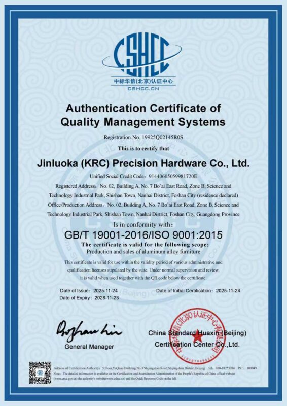 As the aluminum alloy furniture market evolves, Jinluoka (KRC) Precision Hardware Co., Ltd. is well-positioned to deliver reliable, high-performance solutions backed by globally recognized quality management.